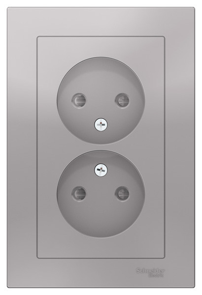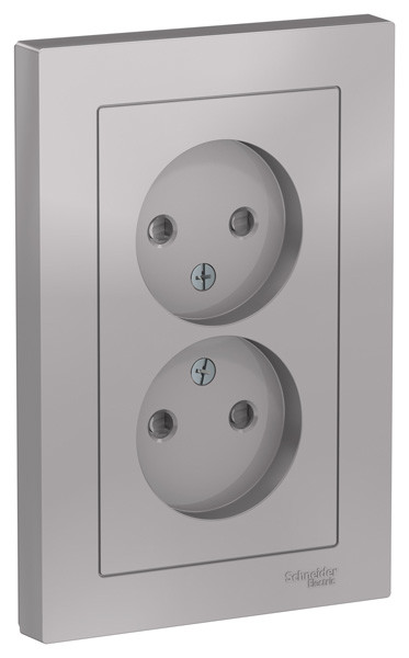 Розетка двойная коллекции AtlasDesign (в сборе, цвет алюминий) без заземления со шторками Подходит для использования в сетях напряжением 250 В с током до 16 А. - Лицевые панели из качественного ABS-пластика, устойчивого к царапинам и УФ-излучению. - Усиленные прямые монтажные лапки для лучшей фиксации механизма в монтажной коробке. - Двойная розетка позволяет подключить два устройства в одном месте. - Изделие поставляется в комплекте с рамкой того же цвета.