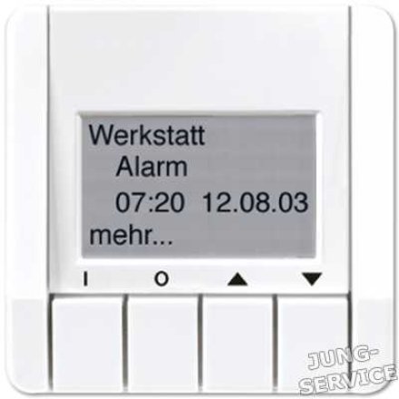 The LCD Info Display receives telegrams by the KNX and offers the possibility of a visual indication (LCD display) of free programmable text and values. Up to 12 pages with 1, 2 or 4 lines can be defined. To each line one function (as switching, dimming, value indication, etc.) can be assigned. On an additional alarm page up to 12 alarm messages can be administrated. To each alarm message, different alarm options as i.e. acoustic signal can be defined. The two keys on the right are used for scrolling up and down through the messages. The two keys on the left are assigned to the display line respectively selected.