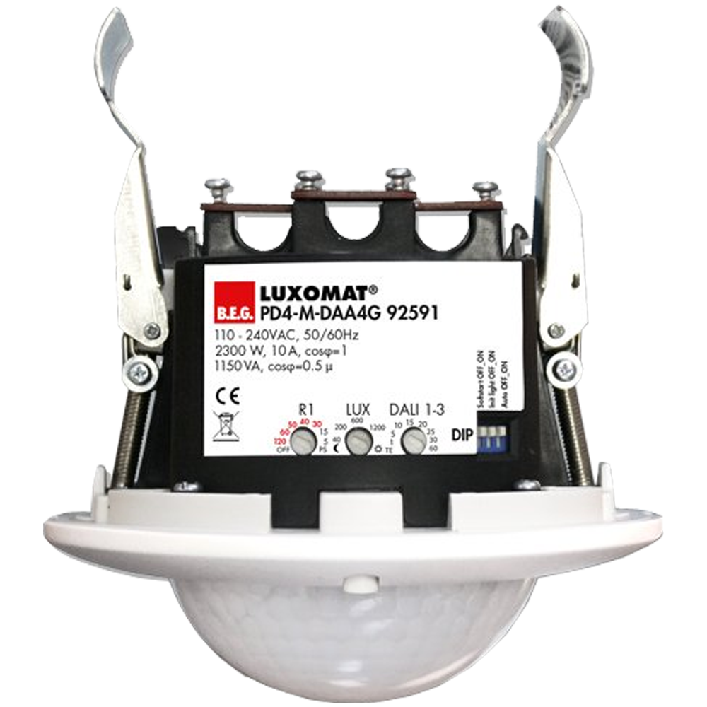 3 зоны освещения: A для основного освещения с сегментированной регулировкой постоянного освещения с помощью 3 групп DALI и контроля смещения, B для освещения кафедры или классной доски с помощью отдельной группы DALI, C для освещения кафедры или классной доски с помощью встроенного реле Мощное реле переключения для различных режимов работы, например, функция отключения для балластов DALI, кондиционирования воздуха, подсветки классной доски. Ручное переключение или затемнение с помощью обычных кнопок Зона обнаружения может быть расширена до четырех подчиненных устройств типа PD4-S-DAA4G Полный набор функций можно активировать только с помощью ИК-адаптера B.E.G. или BLE-IR-адаптера и совместимого смартфона или планшета (Android, iOS). Внешний датчик освещенности может поворачиваться на 45 Предотвращение потерь системы освещения в режиме ожидания в соответствии с EnEV DIN V 18599-4 -