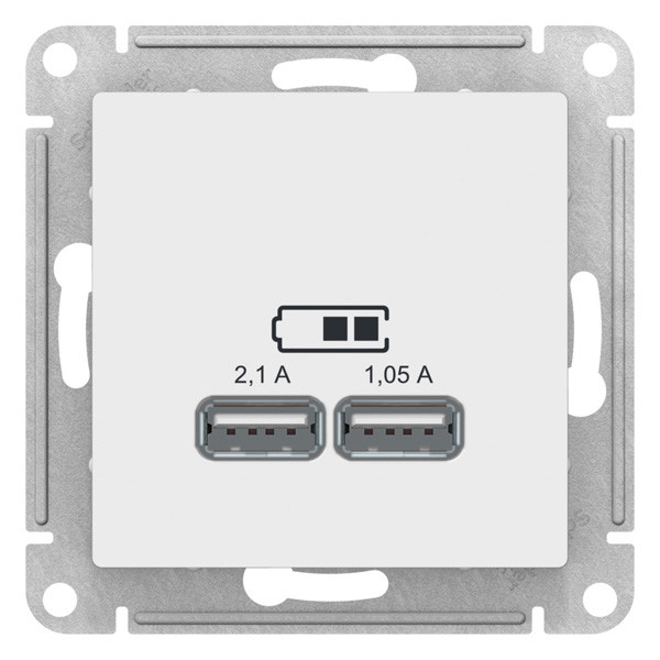 Механизм коллекции AtlasDesign в исполнении ЛОТОС розетки для зарядки с двумя разъёмами USB с выходными напряжением 5 В постоянного тока и выходами с номинальным током по 2,1 А. - USB розетка позволяет напрямую заряжать одно или два мобильных устройства. - Лицевые панели из качественного ABS-пластика, устойчивого к царапинам и УФ-излучению. - Усиленные прямые монтажные лапки для лучшей фиксации механизма в монтажной коробке.