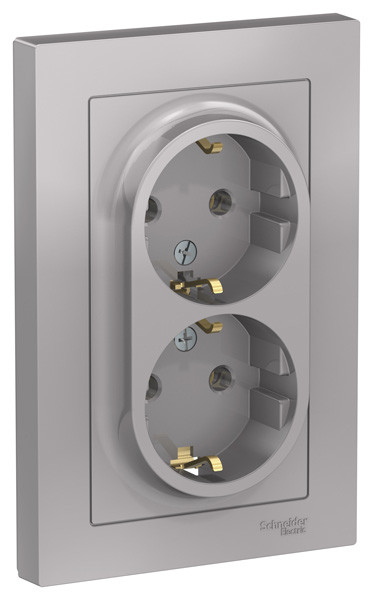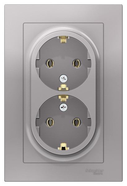 Розетка двойная коллекции AtlasDesign (в сборе, цвет алюминий) с заземлением, без шторок Подходит для использования в сетях напряжением 250 В с током до 16 А. - Заземляющий контакт обеспечивает дополнительную защиту от удара электрическим током. - Лицевые панели из качественного ABS-пластика, устойчивого к царапинам и УФ-излучению. - Двойная розетка позволяет подключить два устройства в одном месте. - Изделие поставляется в комплекте с рамкой того же цвета.