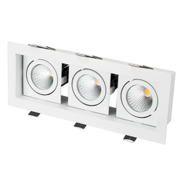 Встраиваемый карданный светильник. Угол 38°/3x9Вт/БЕЛЫЙ 6000K/2240лм, CRI>80. Корпус из белого алюминия. Питание AC180-240V, 27Вт, в комплекте 3 драйвера 200mA 30-45V. Размеры LxWxH: 260х102x85мм, отверстие для установки 240x85мм.Характеристики: