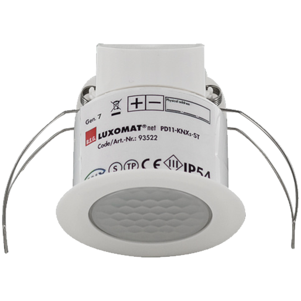 Низкопрофильный детектор присутствия KNX со встроенным шинным разъемом KNX KNX Secure готов Параметризация из ETS 5 для интеграции в системы KNX Индивидуальная настройка чувствительности датчика PIR Смешанное измерение освещенности с использованием внутренних и дистанционных (опционально) датчиков освещенности Интеллектуальный полуавтоматический режим, режим регулирования, не зависящий от занятости (фотоэлектрический переключатель), полностью автоматический режим 1 x световой выход (для регулирования или переключения), 1 x ведомый выход, 3 x выхода HVAC (программируемые отдельно) Регулировка до трех групп освещения с помощью смещения (возможно внешнее воздействие) Короткое присутствие, саморегулирующееся время наблюдения, функция коридора Различные функции блокировки Плавный запуск Воспоминание о светлых сценах Отключаемые индикаторы состояния Базу данных продуктов для импорта в базу данных ETS можно загрузить с домашней страницы B.E.G. Зона обнаружения может быть расширена благодаря режиму master-slave Широкие возможности оптимизации для измерения освещенности Измеренное значение освещенности передается на шину Адаптация кривой затемнения Двунаправленное дистанционное управление -с поддержкой ИК-адаптера и приложения B.E.G. для смартфонов PIN-код ИК-пульт дистанционного управления -возможность использования с помощью ИК-пульта дистанционного управления (опционально) -