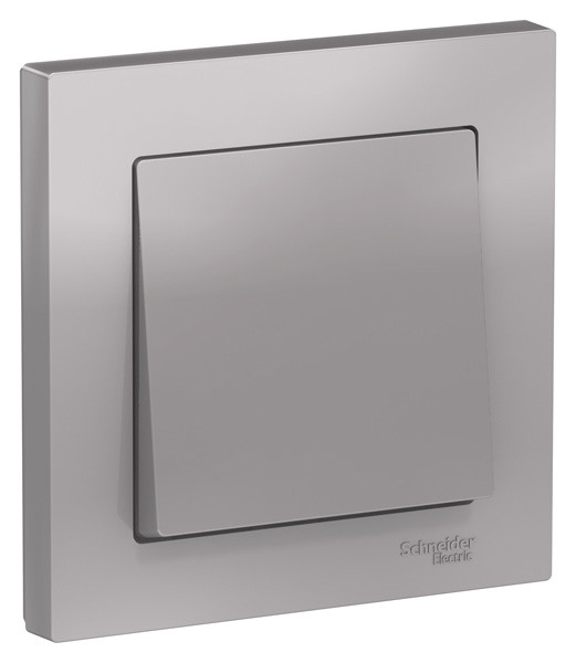 Выключатель 1-клавишный в сборе коллекции AtlasDesign в исполнении алюминий Применим для подключения к сетям 250 В с номинальным током 10 А.. - Лицевые панели из качественного ABS-пластика, устойчивого к царапинам и УФ-излучению. - Усиленные прямые монтажные лапки для лучшей фиксации механизма в монтажной коробке. - Изделие поставляется в комплекте с рамкой того же цвета.