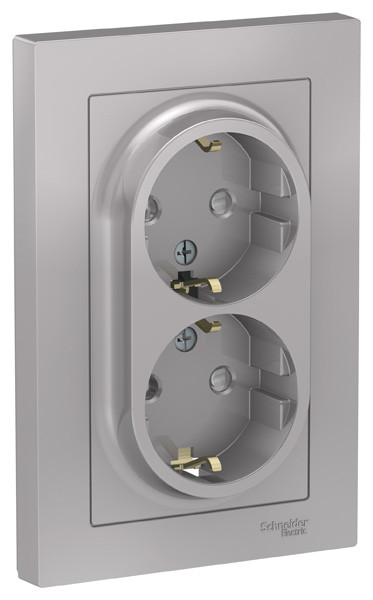 Розетка двойная коллекции AtlasDesign (в сборе, цвет алюминий) с заземлением и шторками Подходит для использования в сетях напряжением 250 В с током до 16 А. - Заземляющий контакт обеспечивает дополнительную защиту от удара электрическим током. - Лицевые панели из качественного ABS-пластика, устойчивого к царапинам и УФ-излучению. - Двойная розетка позволяет подключить два устройства в одном месте. - Изделие поставляется в комплекте с рамкой того же цвета.